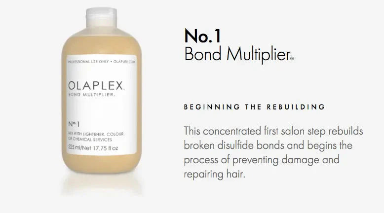 This is the first step of the In-Salon OLAPLEX System which is used as an additive to lessen damage during chemical processing. It is also used as the first step in our Stand-Alone Treatment that prevents damage by restoring and repairing the hair.